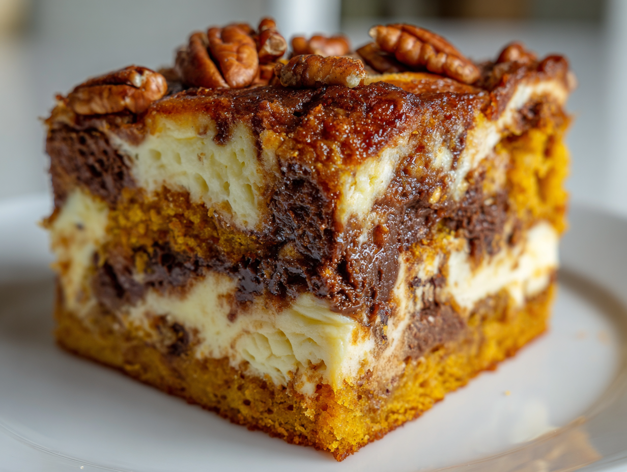 A rich and decadent dessert combining pumpkin spice flavors with a gooey, layered texture.