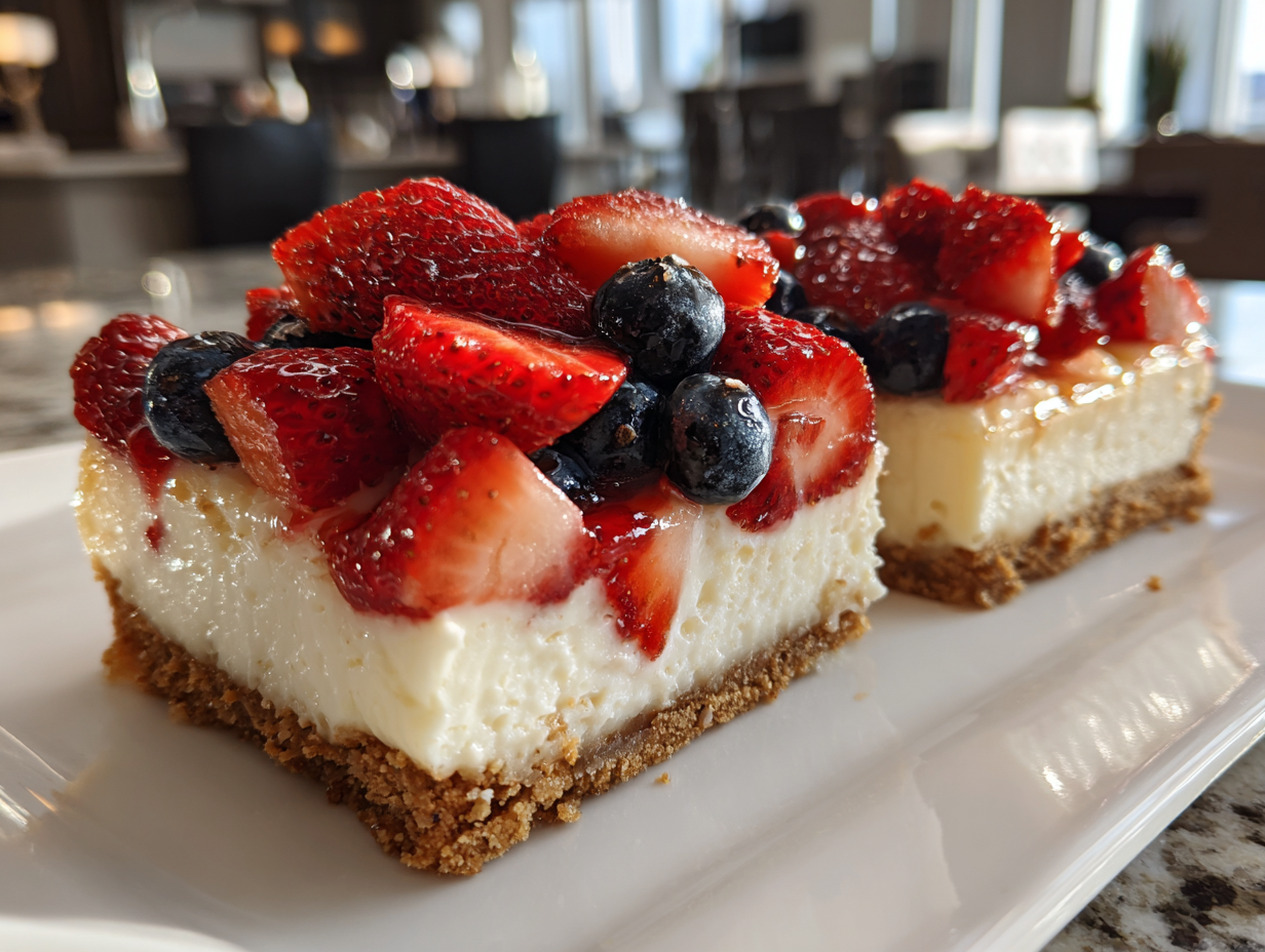 Nothing makes me happier than seeing your berry-topped masterpieces! Snap a pic of your cheesecake bars all dressed up in their patriotic finest – I live for those creative berry arrangements. Did you try swapping raspberries? Add a dusting of powdered sugar “stars”? Tell me all about it in the comments below!